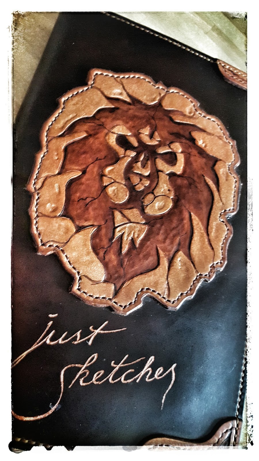 Auf die Deckseite habe ich den von mir angefertigten Löwenkopf aufgeleimt und schließlich noch vernäht.