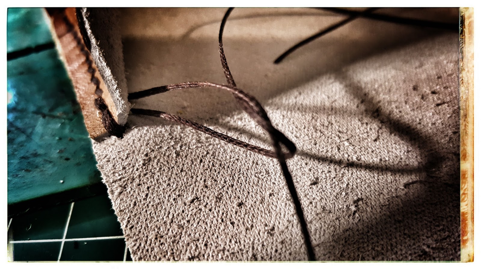 Die erste Nahtschlaufe über das Lederende laufen lassen.