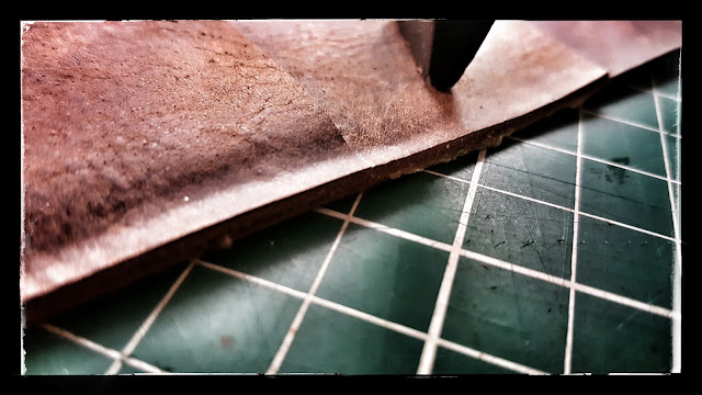 Das Leder wird zugeschnitten und die Leimflächen sowohl auf der Rückseite