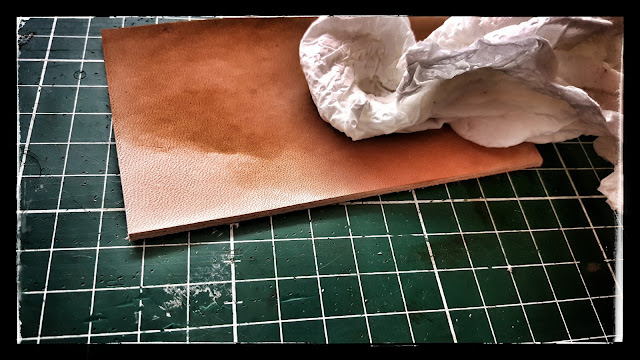 Nun werde ich auf den Deckel mein Logo einprägen, dazu feuchte ich das Leder an und warte bis es