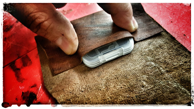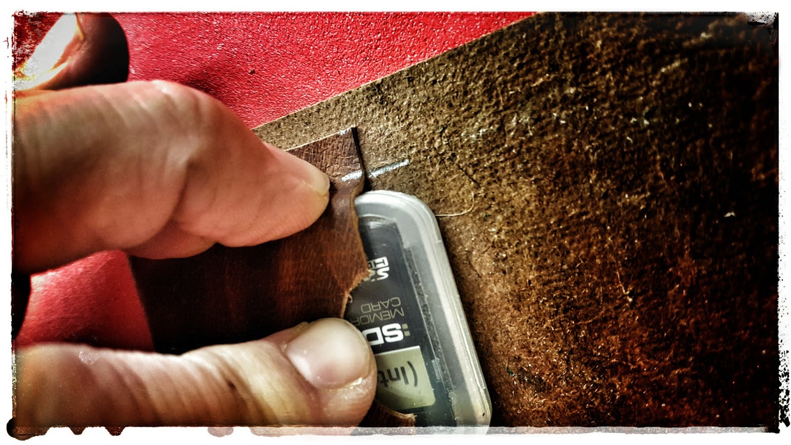 Als kleine Hilfe zum greifen der Schachtel schneide ich eine auskerbung für die Finger in das Leder.