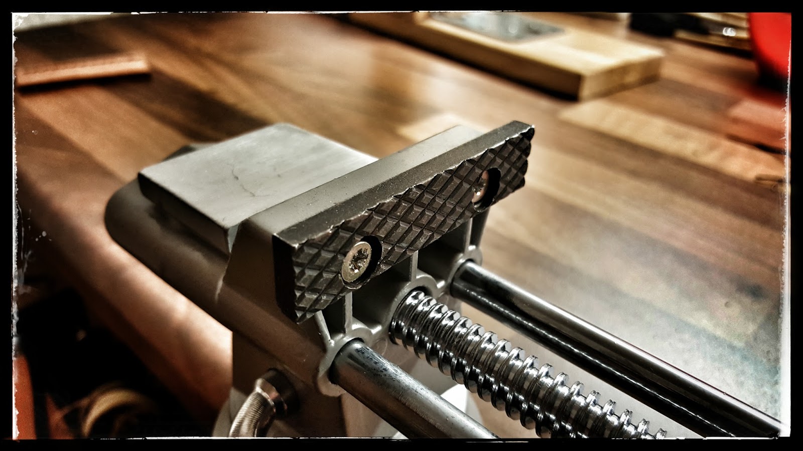 Die neuen hölzernen Spannbacken wieder an den Schraubstock geschraubt.